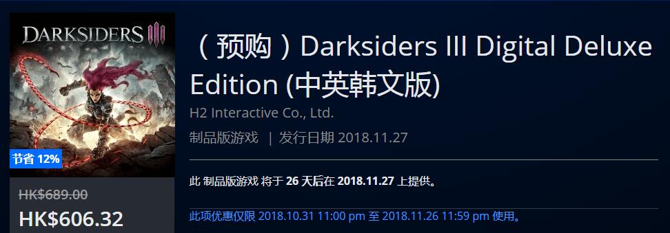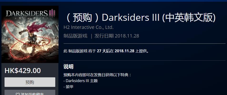 PSN港服商店上架PS4《暗黑血统3》中文版预购页面