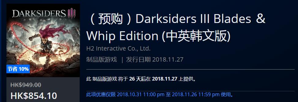 PSN港服商店今日已经上架了PS4《暗黑血统3》中文版的预购页面,分别上架了标准版、豪华版、Blades & Whip版。标准版售价429港币、豪华版售价606港币、Blades & Whip版售价854港币。购买豪华版或Blades & Whip版的玩家可提前24小时游玩本作。