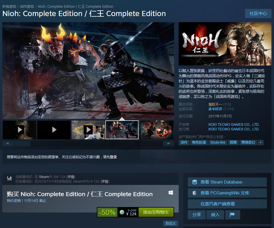 Steam《仁王 年度版》半价折扣,国区史低价仅售124元!