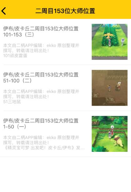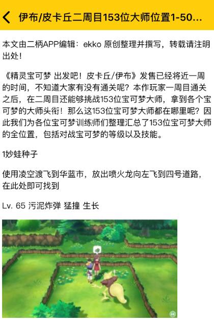 《精灵宝可梦 出发吧!皮卡丘/伊布》发售已经将近一周的时间,不知道大家有没有通关呢?本作玩家一周目通关之后,在二周目还能够挑战153位宝可梦大师,拿到各个宝可梦的大师头衔!那么这153位宝可梦大师都在哪里呢?因此我们为各位宝可梦训练师们整理汇总了153位宝可梦大师的全位置,包括对战宝可梦的等级以及技能!各位可以在《精灵宝可梦 出发吧!皮卡丘/伊布》的【攻略】页面中查看,为了方便玩家们查找,我们将该攻略分为了三篇,分别对应“No.1~No.50”、“No.51~No.100”、“No.101~No.153”宝可梦大师。大家也可以通过关注二柄微信公众号(erbing818),回复“宝可梦”来获取这份攻略!