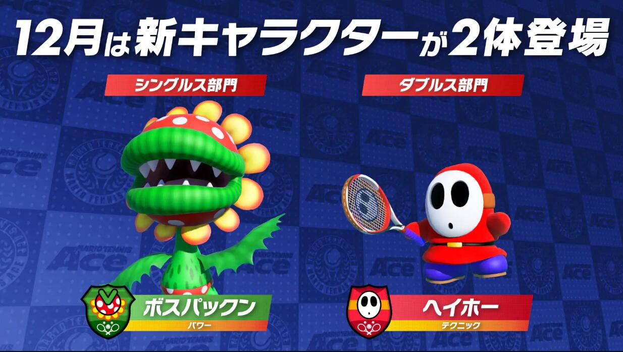 任天堂将于12月1日为《马里奥网球ACE》推出2.1版本更新。更新将推出线上双打锦标赛,既可以和本地的好友一同游玩,也可以和线上的好友合流参赛,同时也支持和实力相近的玩家随机匹配参赛。锦标赛还会加入等级评定系统,原本的积分将会对应S、A、B、C四个等级。新的参战角色:“嘿虎”和“吞食花”。更新还将带来新的线上四人合作任务,奖励是异色耀西,任务截止至2019年1月10日。