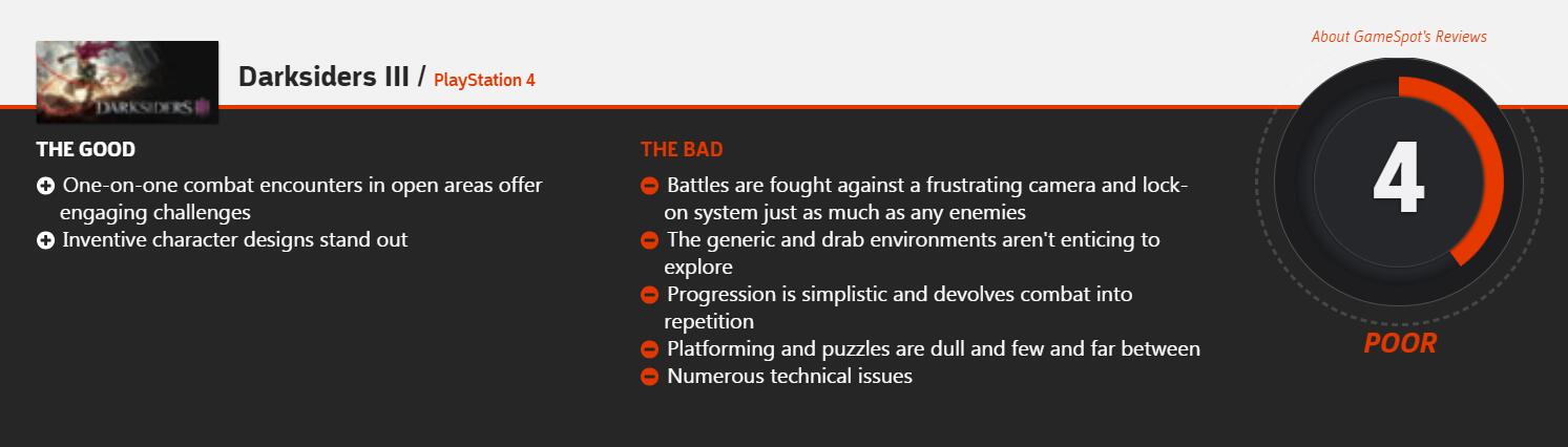 又见分歧!《暗黑血统3》的首批媒体评分已经解禁,其中IGN给本作打了7分的评价,而GameSpot则为本作给出了4分的评分。IGN认为,在玩家探索过如此众多的开放世界后,《暗黑血统3》的简洁性给人耳目一新的感觉,这种简洁性并非指其战斗系统或Boss战,相反本作的战斗系统和Boss战斗复杂的令人吃惊。沉浸于动作游戏时代的玩家一定会对游戏感到满意,但是作为系列时隔多年后的首款作品,如果加入一些新概念可能会让游戏变得更好。总之,《暗黑血统3》是一个纯粹的动作游戏,适合喜欢挑战老式游戏的玩家。GameSpot认为游戏中1对1的大场景战斗带来吸引人的挑战,别出心裁的角色设计也十分出众。不足之处在于,游戏的镜头与锁定机制并不是很合理,游戏环境单调乏味,游戏进程和战斗的重复度都比较高,平台跳跃以及解谜活动又远又少又枯燥,除此之外还有一些技术性问题。