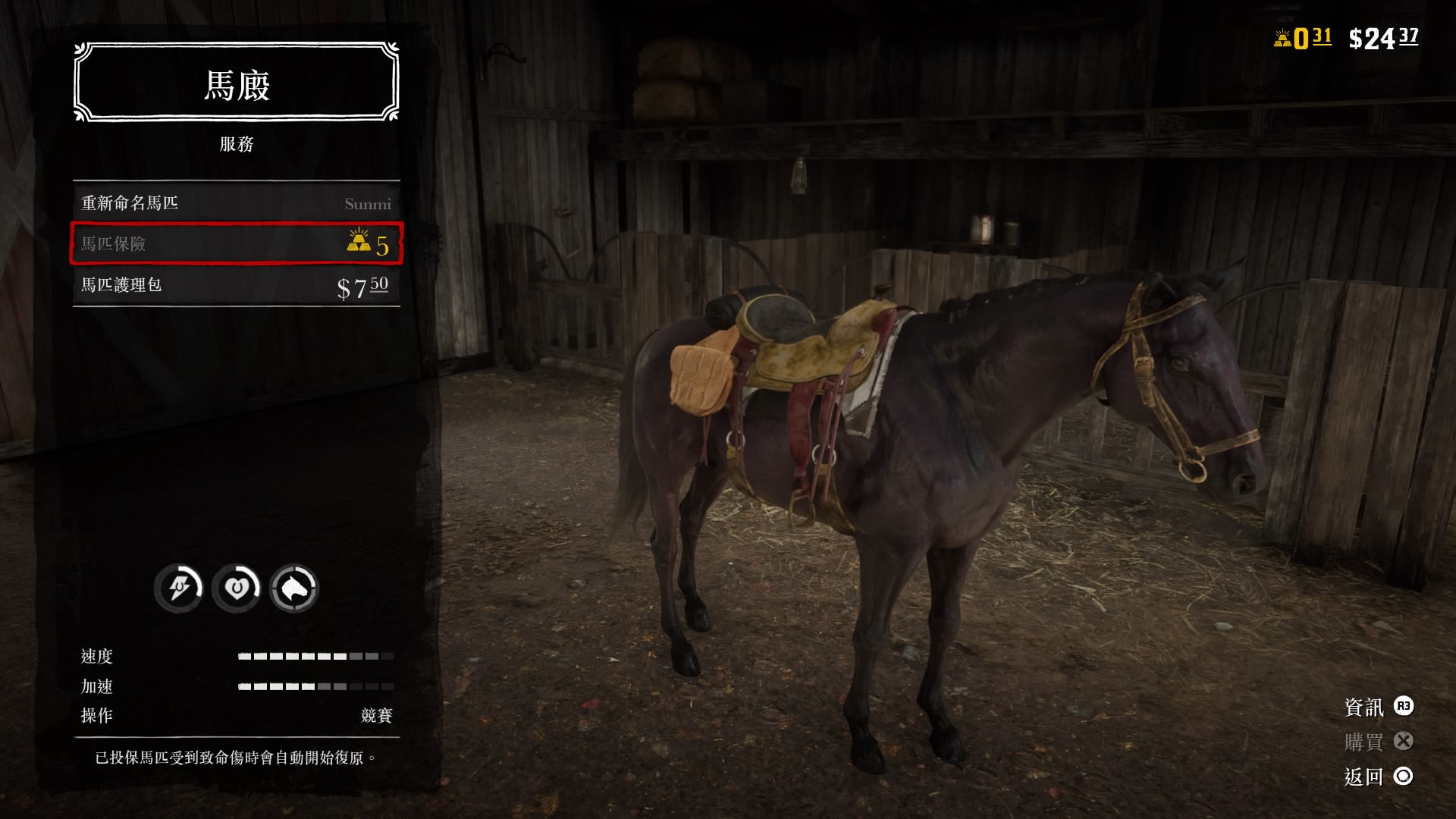 在《荒野大镖客:救赎2》故事模式中,如果你的马匹挂了(初始马匹除外),那么它就是真的挂了,你只能重新购买一匹马。那么也有玩家担心,本作的线上模式是否会沿用这一设定呢?不用担心,在线上模式中,玩家可以通过给马匹购买保险的方式保护马的安全。只要购买了保险,无论马在哪里死亡都能够“原地复活”。不过马的保险可不便宜,一匹纯种马的保险就需要5个单位的黄金。但即使你没有那么多的钱也可以不用那么着急,因为在线上模式中理论上马匹是不会真正死亡的,即使马匹在无保险的状态面临濒死,它也会被送到马厩中。这时你有两个选择:一是通过点击十字键左进入菜单快速治愈你的马,不过这会很贵;而如果你走到附近的马厩中,在马厩里只需很少的代价就能治愈你的爱马。所以各位牛仔可以放一放心了~