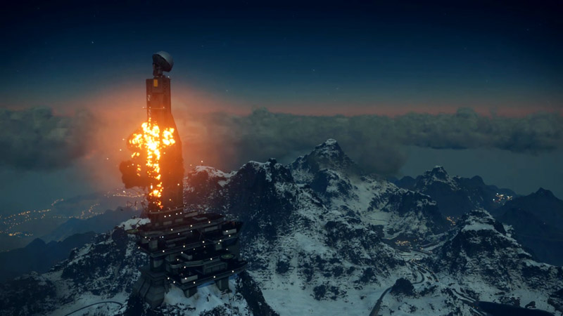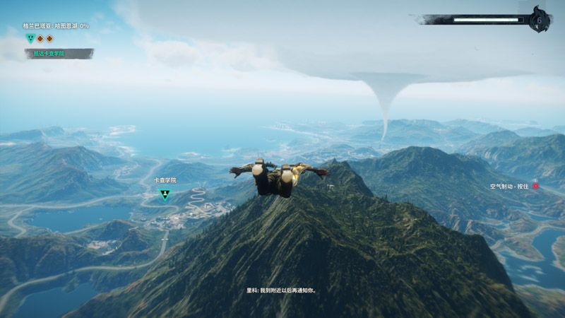 正如前文所述,新引入的极端气候系统是本作的亮点之一,除在宣发时期就作为重点宣传的龙卷风和风暴气候之外,游戏也建立了很完整的地形天气体系,游戏中诸如两个山谷之间的狭缝也会有山风的存在,这些气流会对降落伞和飞翼的运动方向和速度造成影响。而在龙卷风和风暴中这两个装具受到的影响将会更大,风暴天气下,里科可以直接不借助外力就直接使用飞翼扶摇直上,而这个时候如果在没有避雷针的区域飞行,里科身上各种容易感电的金属装备也很容易吸引闪电,当发现电力在主角身体上聚集时,玩家就需要使用抓钩快速移动来避开落雷的伤害。而在龙卷风气候中,所有的可破坏物体和主角都会被龙卷风漩涡强大的吸力所吸引,在游戏的后期,玩家还可以自行生成龙卷风和风暴气候,游戏中也设置了引导龙卷风袭击目标的任务。在这一点上,游戏的开发商雪崩工作室可以说是兑现了宣发阶段给玩家的承诺。