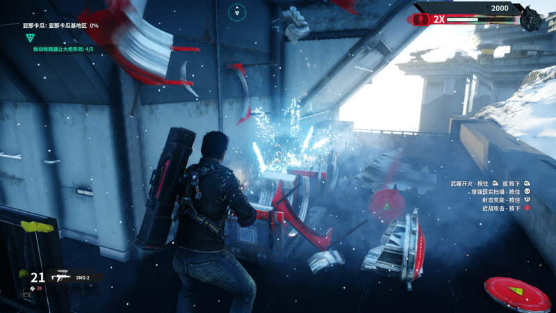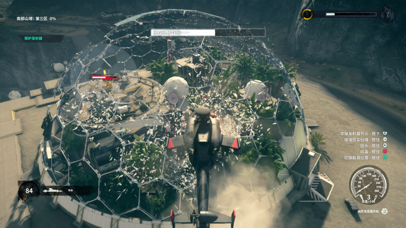 《正当防卫》系列主打的大爆炸和满屏飞粒子的战斗效果自然也在新作中得到了延续,游戏中的武器大多数都带有使用R1触发的特殊效果,如榴弹、自动攻击无人机或者防卫护盾等等,同时武器的射击手感也都比前几作有了长足的进步。敌人种类的变化也变得更加丰富多样,诸如拥有隐身技能或可以支起护盾的敌人可以在玩家碾压普通步兵的过程中带来多多少少的新鲜感,而使用磁轨炮或者导弹与空中成群的直升机或据点大炮进行战斗才是操作里科横扫据点的所在。