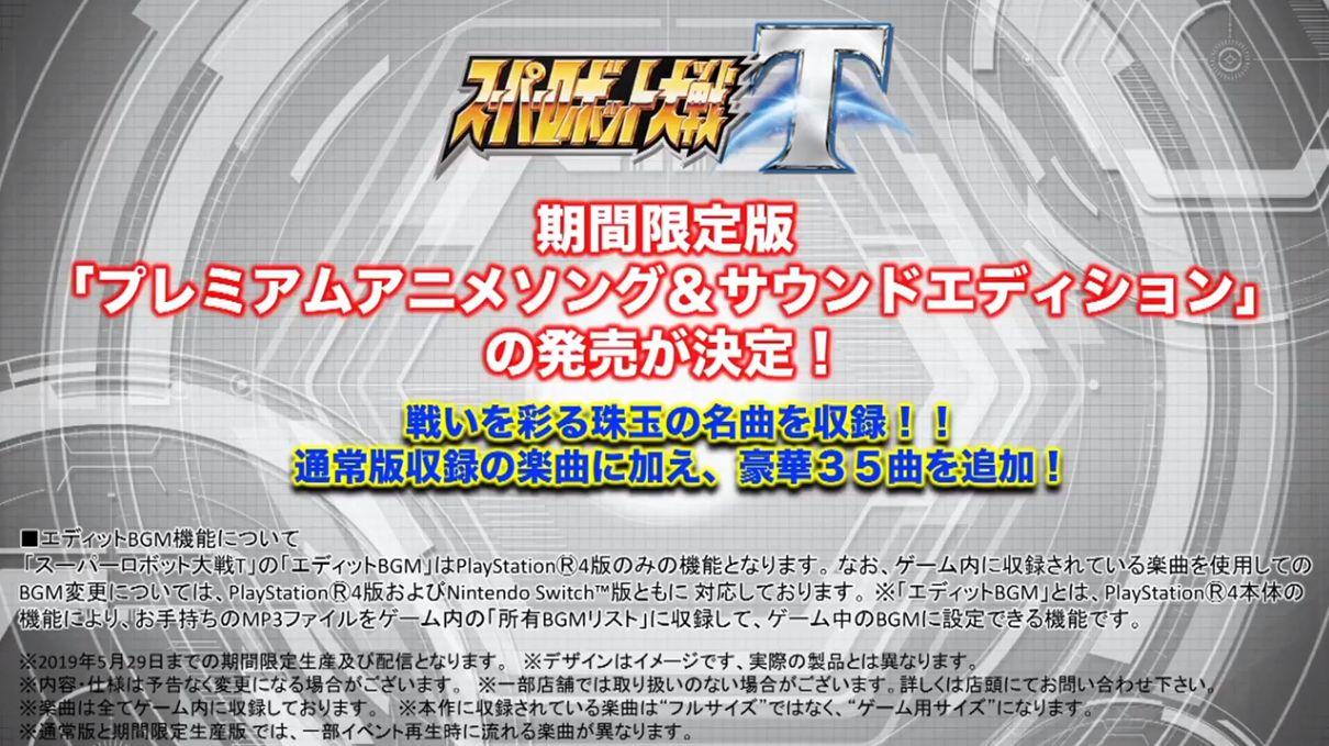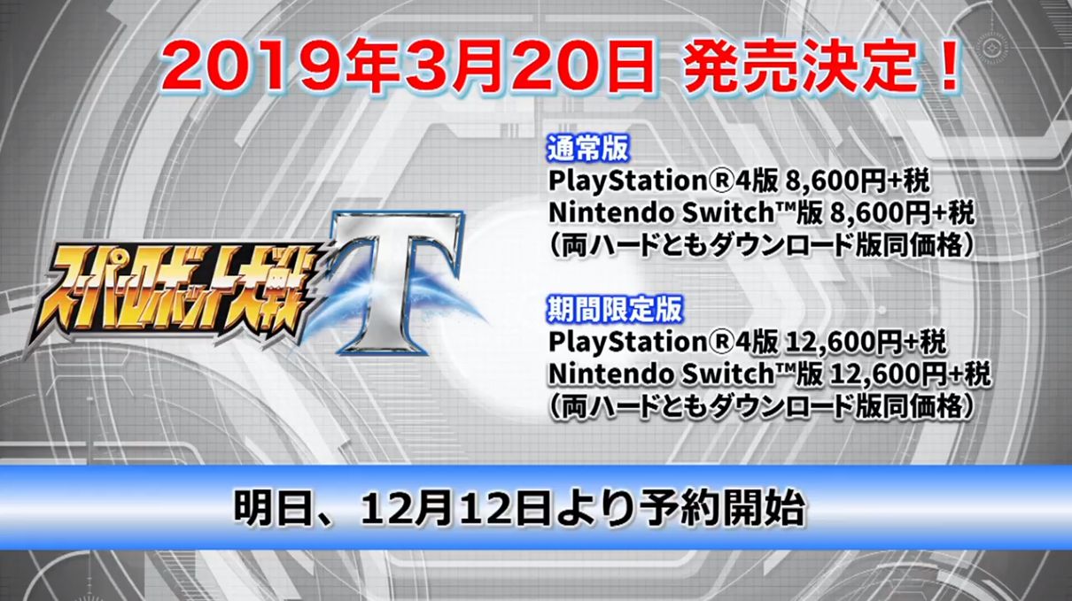 Bandai Namco在今日的直播活动中宣布,《超级机器人大战T》将于2019年3月20日正式发售,登陆PS4及Switch平台。同时还将推出附带35首动画主题曲的限定版游戏。普通版游戏售价8600日元(约524元),限定版售价12600日元(约768元)。此外,本作中文版也将同步发售。