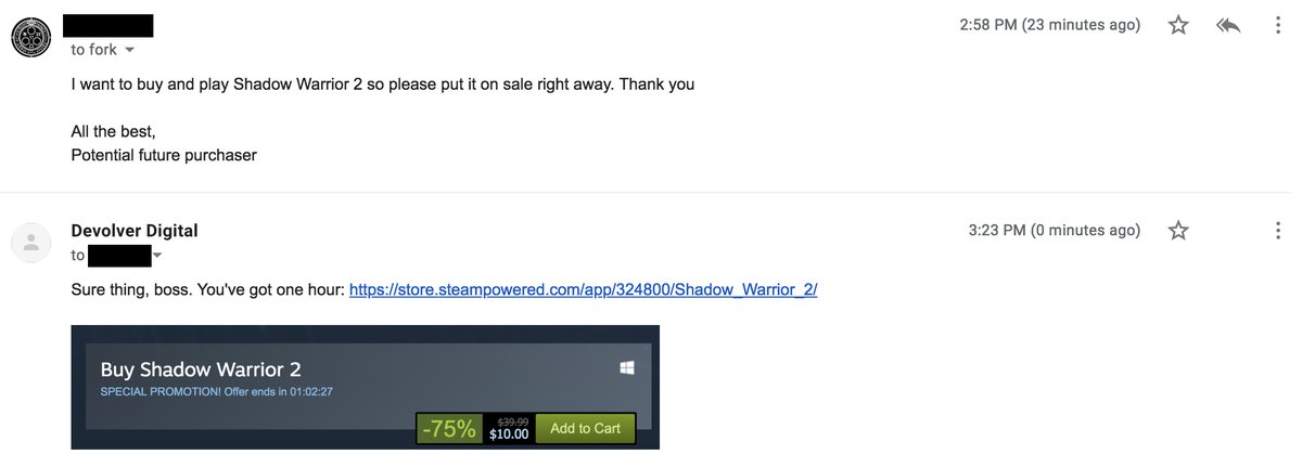 游戏太贵怎么办?你是否有考虑过联系开发商让他们开启折扣优惠呢?近日就有玩家向开发商Devolver Digital发了一封邮件,该玩家表示自己很想购买《影子武士2》这款游戏,但是无奈游戏太贵希望能打折优惠。然后Devolver Digital就真的如玩家所愿,开启了游戏2.5折优惠,限时1小时提供该玩家购买(目前优惠活动已经结束)。在获得玩家们好评口碑的同时,《影子武士2》也凭借此次限时优惠暂时上榜了Steam的主页推荐页面。