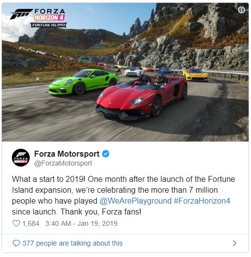 距离《极限竞速:地平线4》最新的DLC“财宝岛”发售已经过去了一个月了,而游戏的市场表现也达到了新的高峰,根据《极限竞速》官推发表的庆祝推特来看,《极限竞速:地平线4》已经在新年到来之际达到了700万玩家的新里程碑,作为一款长卖型的竞速游戏,《极限竞速:地平线4》已经表现出了其持续增长的强劲动力,而开发商对其的长线支持也赢得了玩家的青睐。目前《极限竞速:地平线4》已经登录了Xbox One和PC平台,支持XPA游玩。