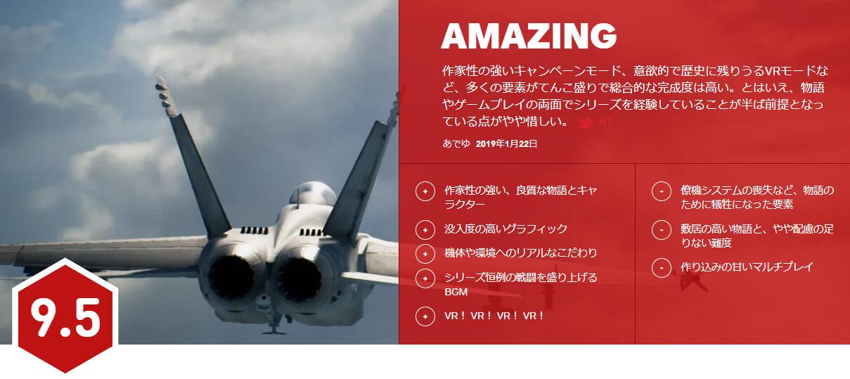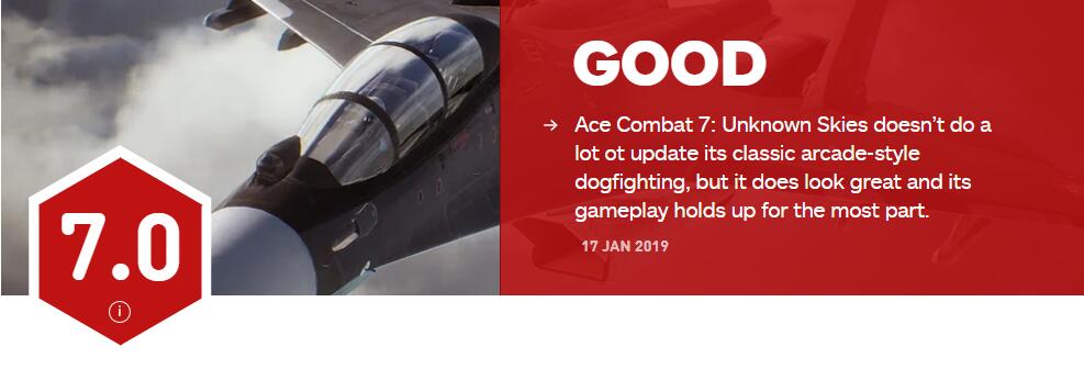 在继此前IGN北美为《皇牌空战7》打出了7分评价之后,IGN日本则在今日为《皇牌空战7》打出了9.5的超高评价!并表示《皇牌空战7》有着非常优秀的故事剧情以及人物角色刻画,新增的天气系统加强了游戏临场感,BGM依旧保持了系列的高水准,VR模式更是带来了全新的游戏体验;不足之处则在于为了故事剧情而没有加入以往的一些经典系统,游戏门槛有点高。而制作人河野一聪在此前也对IGN北美仅为《皇牌空战7》打出7分评价表示非常失望,质疑IGN北美的评测视频中为何只有“普通模式”的画面,又为何没有体验游戏的EXPERT操作模式。