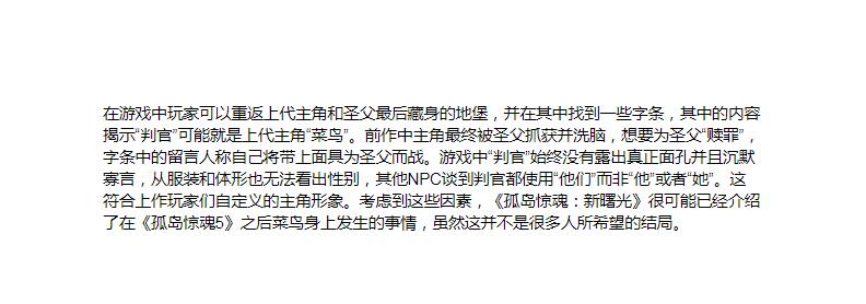 【剧透提醒】《孤岛惊魂:新曙光》作为《孤岛惊魂5》的续作,前作中主角“菜鸟”的命运被不少玩家所关注。近日游戏中雇佣兵“判官”的身份引发了外媒猜测,详情见配图。