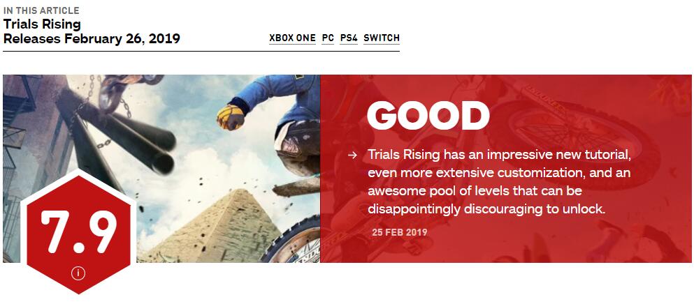 IGN今日为育碧的摩托动作游戏《特技摩托:崛起》给出了7.9分的良好评价。IGN认为游戏提供了许多有史以来最酷的关卡,在高难度特技方面的教学也做的比以往要好。尽管游戏提供了种类丰富的赛道,但却被解锁的方式所拖累。不过总的来说,本作拥有出色的教程,广泛的定制内容以及一大波酷毙了的赛道,尽管要全部解锁它们并非易事。