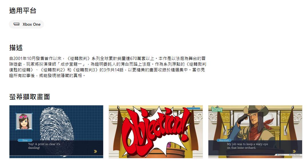 Xbox商店删除《逆转裁判合集》“更新添加中文支持”介绍