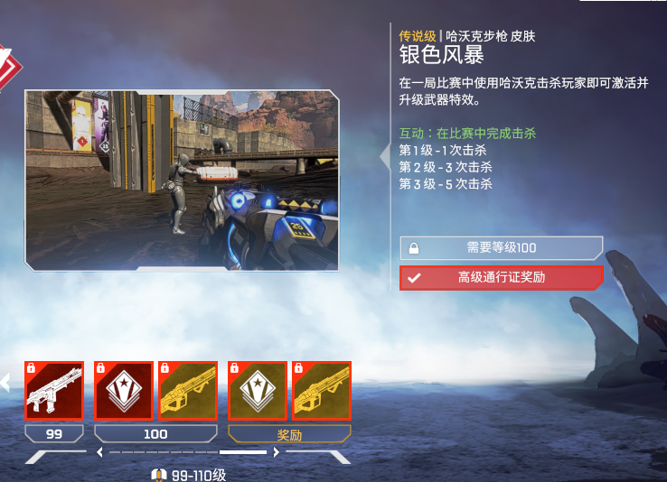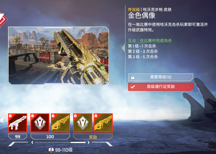 《Apex英雄》战斗通行证和第一赛季更新已经实装,相信不少玩家昨晚已经体验到了新版本游戏。而我们知道根据官方此前的说法,战斗通行证总共有100个等级(你也可以选择用apex金币购买你的通行证等级,每个等级售价150apex金币),不过实际更新之后情况似乎有了变化。在100级时,你能获得的奖励是一款“银色风暴”哈沃克步枪皮肤,不过,在100级之后,似乎还有更加炫酷的110级奖励!在第110级,你可以获得一款动态狂野边境等级徽章,和一款“金色偶像”哈沃克步枪皮肤。这款皮肤同样拥有进化特效,材质也与“银色风暴”相似,不过配色换成了更加亮眼的“土豪金”色。从显示页面来看,似乎100级-110级是一次性的升级(中间没有其他等级)。你觉得这款“土豪金”皮肤对你的眼缘吗?