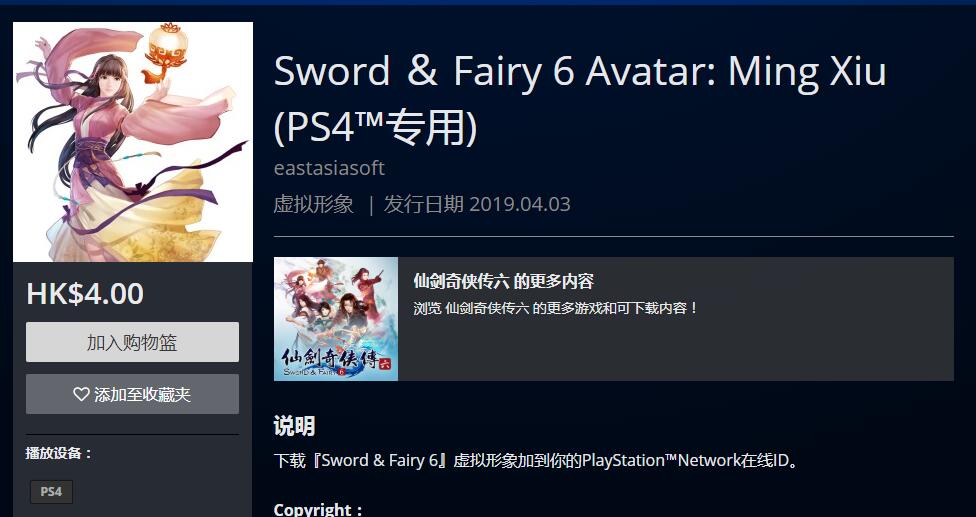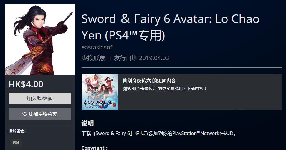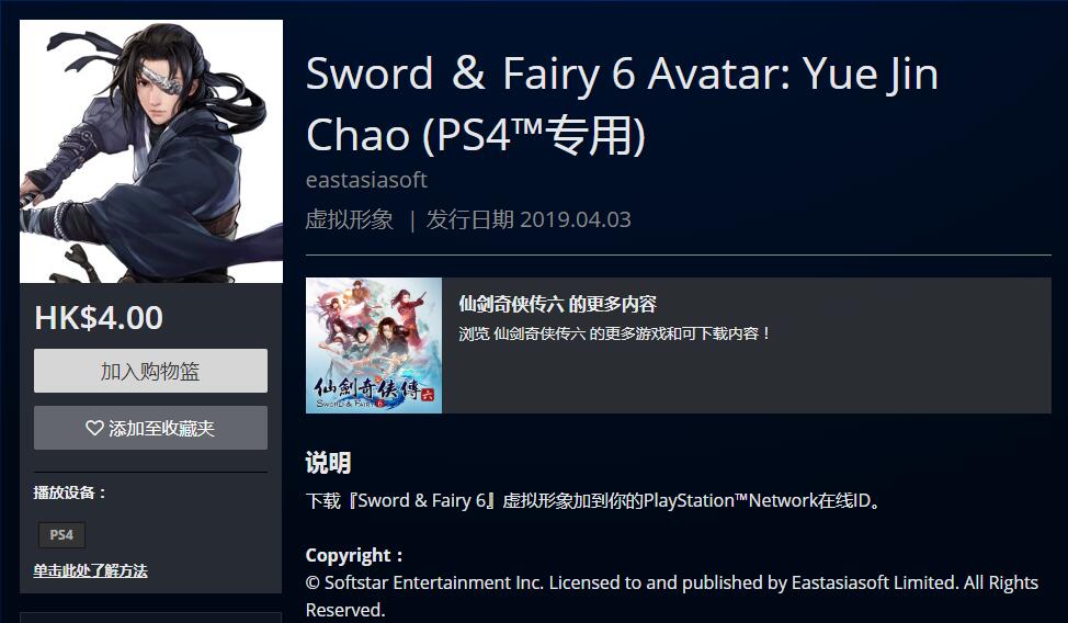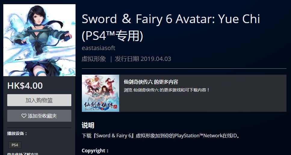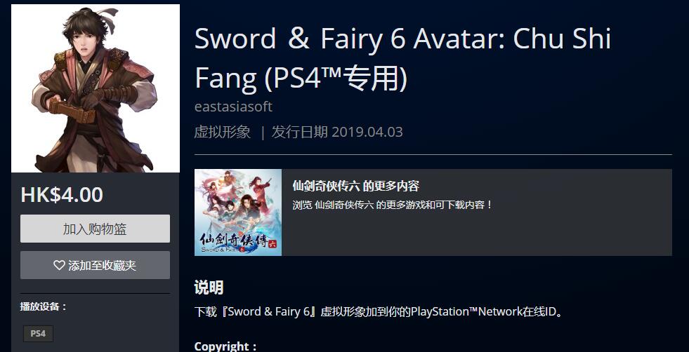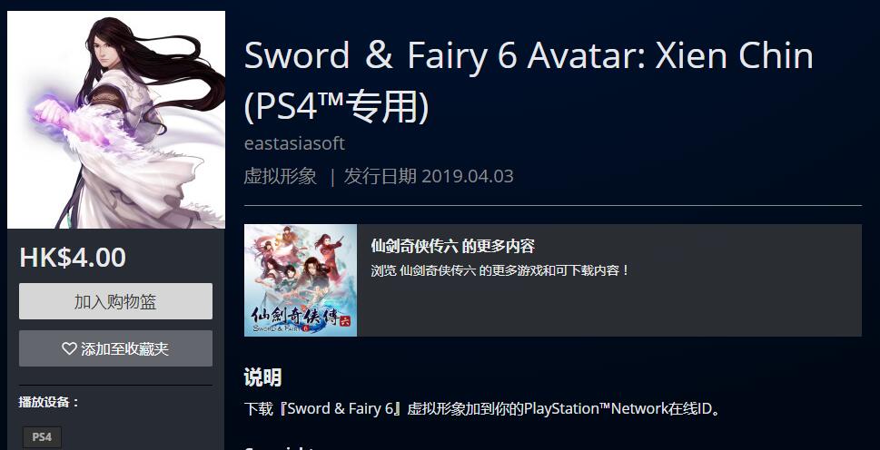 PSN HK商店今日除了上架PS4版《仙剑奇侠传6》游戏本体之外,还上架了一组角色头像,分别为“越今朝”、“明绣”、“越祈”、“居十方”、“洛昭言”、“闲卿”,单款售价4港币。