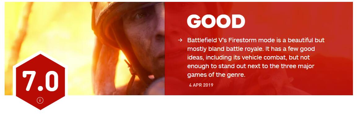 IGN曾为EA系列新作《战地5》的多人模式打出7.5分,但作为多人游戏的重要部分,大逃杀模式——烈焰风暴并没有随着游戏发售而推出。在姗姗来迟后,IGN为这个备受关注的模式单独给出了评分——7.0。IGN认为,虽然该模式继承了《战地5》优秀的武器系统、射击手感和载具战斗,但作为玩家们熟悉的大逃杀模式,它缺乏创新,一切都是那么中规中矩。于是较晚的推出时间让烈焰风暴模式失去了先机,特别是在《APEX英雄》推出之后。《战地5》的烈焰风暴模式与其他大逃杀类游戏差异太小,仅仅是载具的加入并不能从根本上改变这一点。