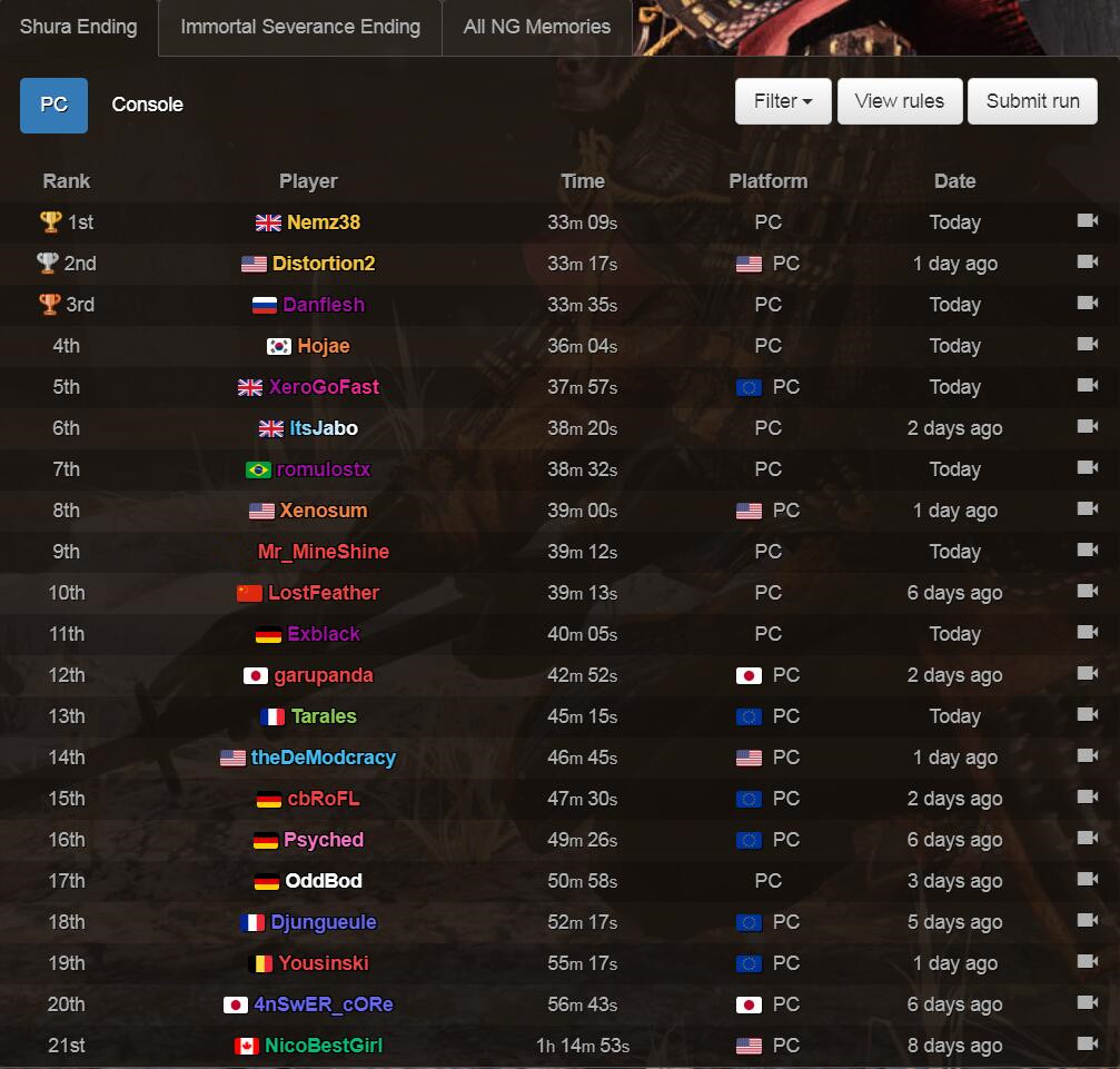 英国选手“Nemz38”33分9秒再次刷新《只狼:影逝二度》速通排行榜