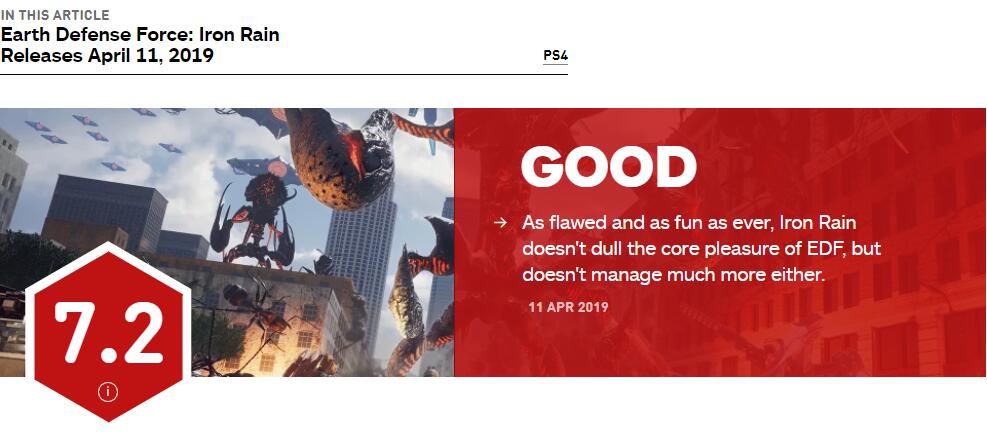 IGN今日为《地球防卫军:铁雨》给出了7.2分的良好评价。IGN认为《铁雨》是一款成功地衍生作品,在它身上系列一如既往的缺陷和乐趣并存,这款作品并没有脱离EDF系列的核心,但同时也没有带来太多的改编。PS4《地球防卫军:铁雨》今日正式发售。