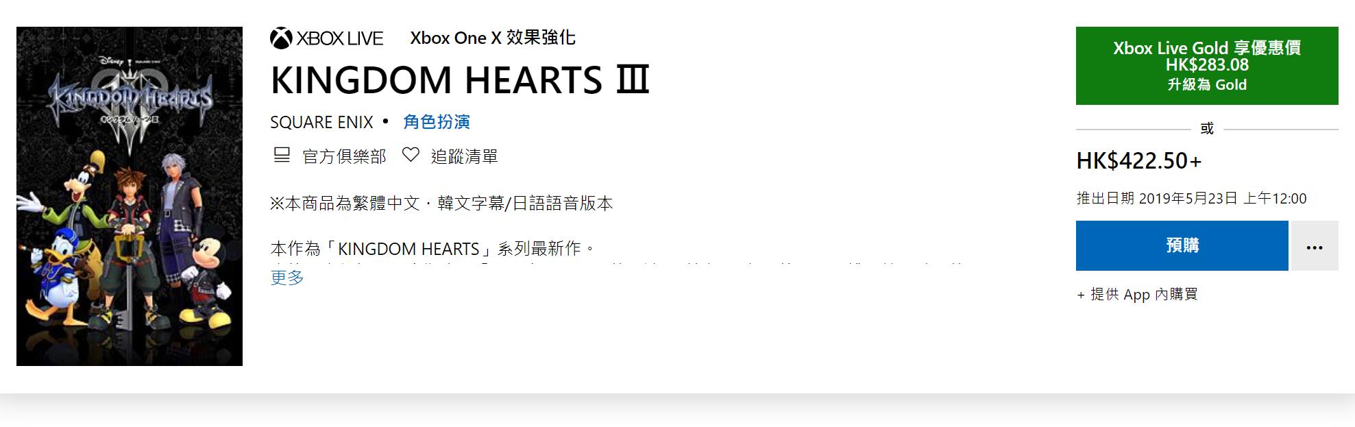 Xbox HK商店今日开启了《王国之心3》中文版预购优惠,游戏原价422港币,而金会员玩家仅需283港币(约242元人民币)即可购买。 由于《王国之心3》中文版是在2019年5月23日发售,所以在正式发售前就推出如此大力度的折扣似乎有点不太合理,暂不清楚是否为“临时工”错误标记了。