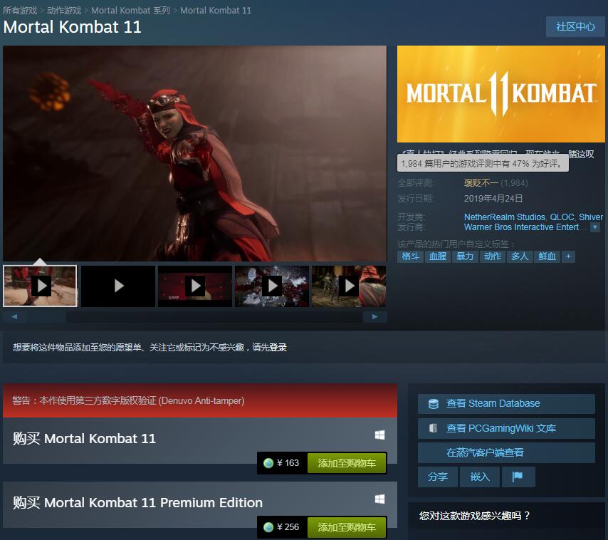 格斗游戏《真人快打11》现已登陆Steam平台,而与媒体一致给出的高分不同,Steam上的玩家好评率只有47%,评价为“褒贬不一”。从评论看,游戏主要的问题在于闪退以及优化问题,不少玩家都出现了游戏卡顿的情况,而闪退这种恶性Bug更是家常便饭。游戏的微交易系统也受到了一些指责。不过,另一方面游戏出色的细节刻画以及优秀的剧情内容则受到了玩家们的一致好评。目前标准版游戏售价163元,与其他平台相比还是比较有优势,想要体验的同学不妨关注一下。