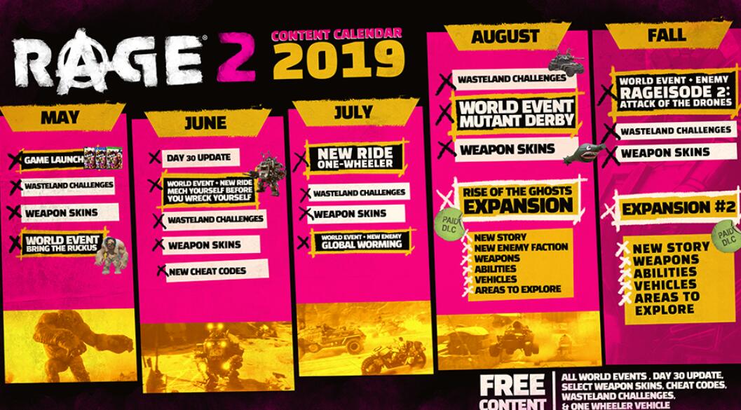 Bethesda在旗下末日废土射击游戏《狂怒2》发售之前公布了未来的内容更新线路图。尽管游戏在5月14日发售就包括大量内容,但游戏发售后的首批推送就精彩纷呈,5-7月的更新包括挑战、武器外观、世界事件、新载具等等,包括大量免费内容。8月份会加入新世界事件和游戏的第一个付费DLC,秋季还将会迎来另一个新的DLC和包括新敌人的世界事件。DLC包括新剧情、武器、能力、载具以及可探索内容,需要另外购买。