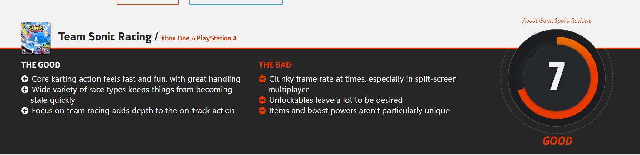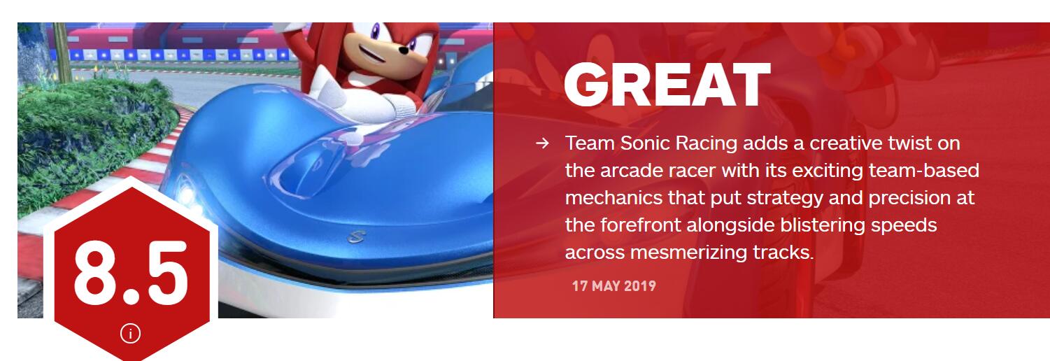 《团队索尼克竞速》评分公布,GameSpot 7分,IGN 8.5分