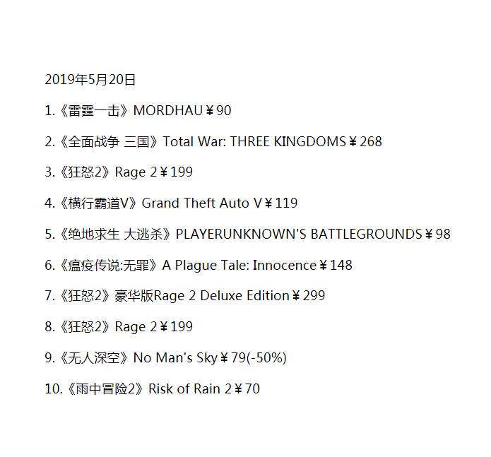 新一期Steam销量排行榜:《雷霆一击》登顶,《全战 三国》及《狂怒2》分列第二、第三