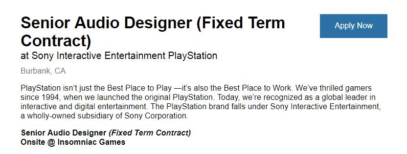 目前看来在继PS4游戏《蜘蛛侠》之后,索尼与Insomniac Games仍将继续合作推出更多游戏作品。近日索尼公布了一份关于高级音频设计师的职位招聘,而应聘者将在Insomniac Games参与游戏开发工作。