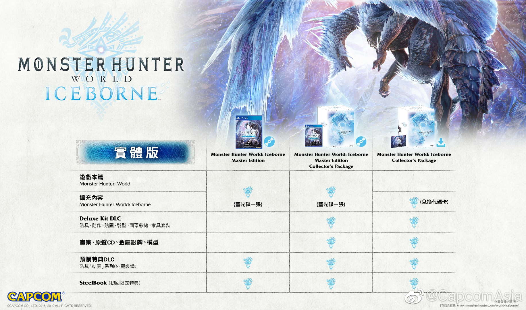 Capcom公布了一组《怪物猎人世界 冰原》新登场怪物“轰龙”和“霜翼风漂龙”的最新截图展示,同时也对游戏版本细节进行了解答。 此次依旧是《怪物猎人世界 冰原》亚洲版才包含简/繁体中文字幕;只有拥有《怪物猎人世界》亚洲版,才能对应《怪物猎人世界 冰原》亚洲版的内容;图7为《怪物猎人世界 冰原》大师版/收藏版/大师收藏版的内容展示汇总。