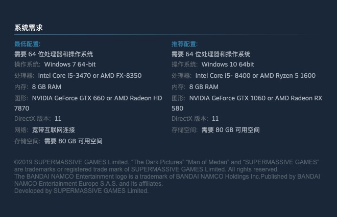 【《棉兰号》PC版需80GB空间,配置需求公布】《黑相集:棉兰号》Steam页面更新了游戏的配置需求,页面显示游戏需要至少80GB左右的储存空间。虽然游戏的单线时长只有5小时左右,但从游戏容量来看,本作将会包含大量的分支剧情和过场动画。此外游戏的配置需求也一并公布。最低配置需要i5-3470 或 FX-8350,以及GTX 660 或HD 7870的组合;推荐配置需要i5- 8400 或Ryzen 5 1600,以及GTX 1060 或RX 580的组合。《黑相集:棉兰号》支持线上和本地多人游玩,将于8月30日发售。