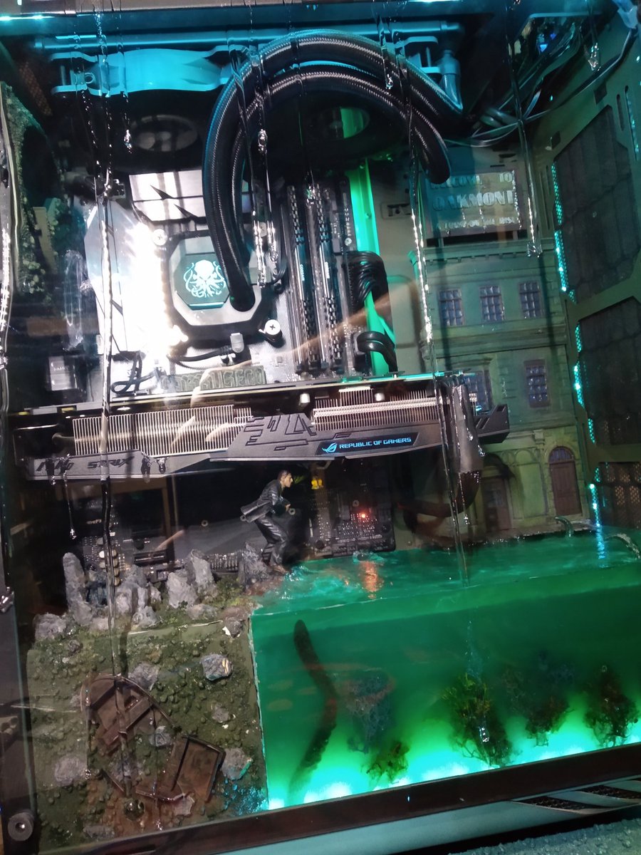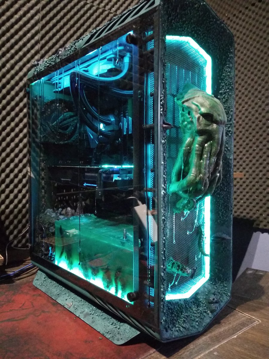 【大触打造《沉没之城》定制版PC,脑洞惊人让人San值狂掉】玩家YonomellamoJavier最近打造了一台《沉没之城》的克苏鲁主题PC主机。这台主机的外表模拟了海底地表的纹路,有的地方甚至还镶嵌了珊瑚。机箱的前面板上则有一个大大的克总浮雕,看上去让人不寒而栗。主机整体采用了青绿色的光效,很好地烘托出了阴森诡谲的气氛。通过全透明的侧面板可以看到作者在机箱内部也花了不少心思,电源和硬盘位分别改成了陆地和水面,内壁则贴上了城市的背景,与“沉没之城”的主题相契合。不知道用这台主机的玩家San值还好吗?