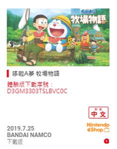 【《哆啦A梦之牧场物语》中文试玩上线】《哆啦A梦之牧场物语》的中文版试玩Demo现已在eShop HK商店上线,输入序列号:D3GM3303TSLBVC0C 即可下载。本作的中文版已于近日单独推出,对本作有兴趣的同学可以先下载试玩进行体验。
