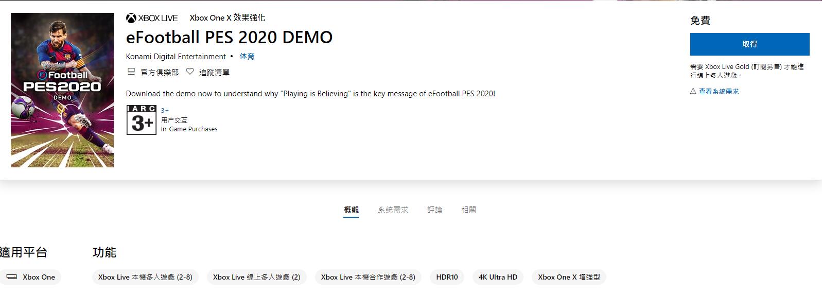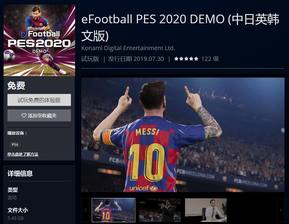 【《实况足球2020》试玩版现已在全平台上线】《实况足球2020》现已在全平台上线了Demo试玩版。试玩版将包括巴塞罗那、阿森纳等14支球队供玩家体验游玩。并且本作将首次在试玩版中首次加入编辑模式,玩家可以充分进行自定义。本Demo的PS4版本大小为5.43GB,Xbox One版本大小为5.9GB.