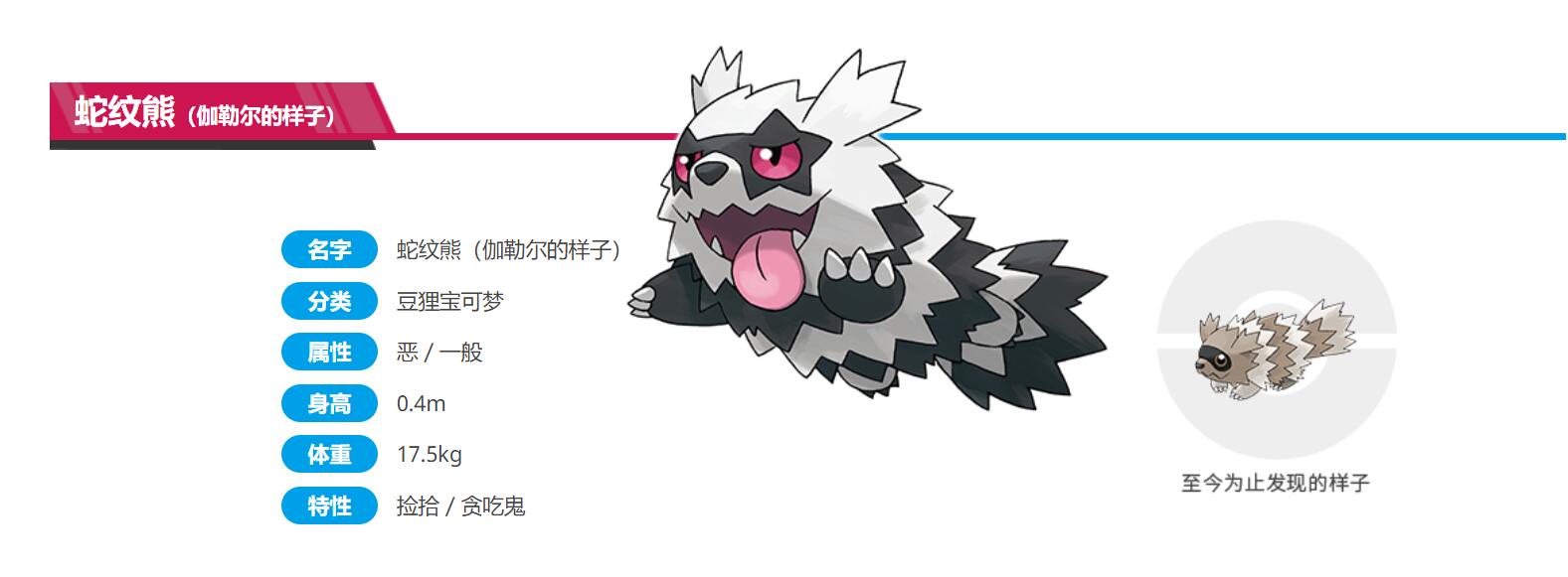 我行我素的原种蛇纹熊:天生我行我素,一刻都安静不下来。栖息于草原、森林和城镇,它们的身影在伽勒尔地区随处可见。蛇纹熊(伽勒尔的样子)被认为是蛇纹熊的原种,其他地区的蛇纹熊之所以举动会宛如蛇行,据说就是因为受到了原种蛇纹熊习性的影响。
