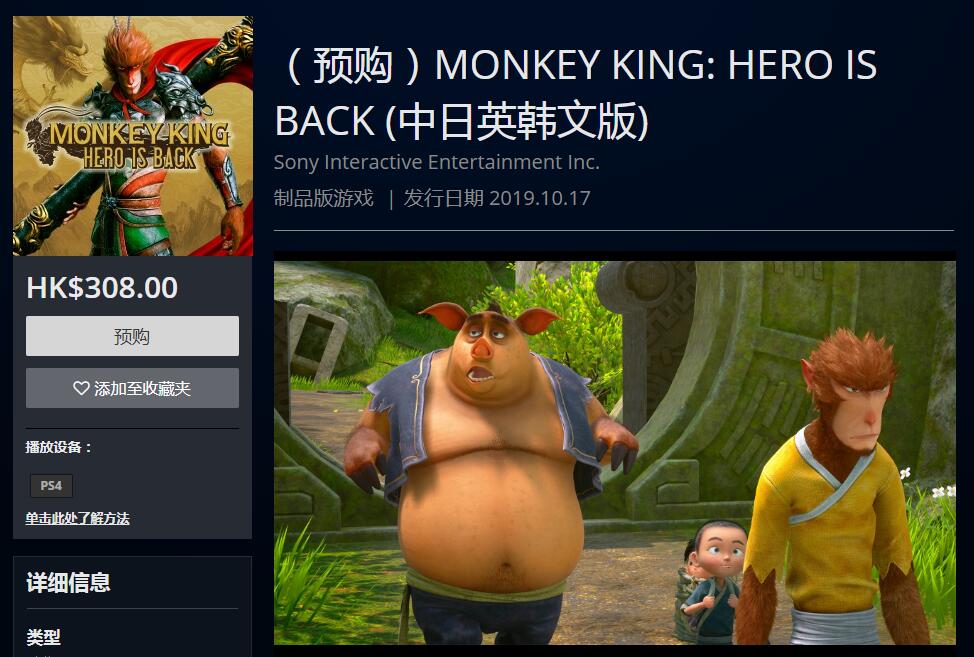 【PS4《西游记之大圣归来》中文版预购上线】PSN HK商店目前已上架《西游记之大圣归来》预购页面,游戏将于10月17日发售,标准版售价308港币,豪华版售价398港币、终极版售价518港币。 其中终极版除了包含游戏本篇,还将附赠追加故事“Episode 1 大闹天宫”、“Episode 2 魂之炼域”,2款追加故事预计在2019年11月和2019年12月推出。