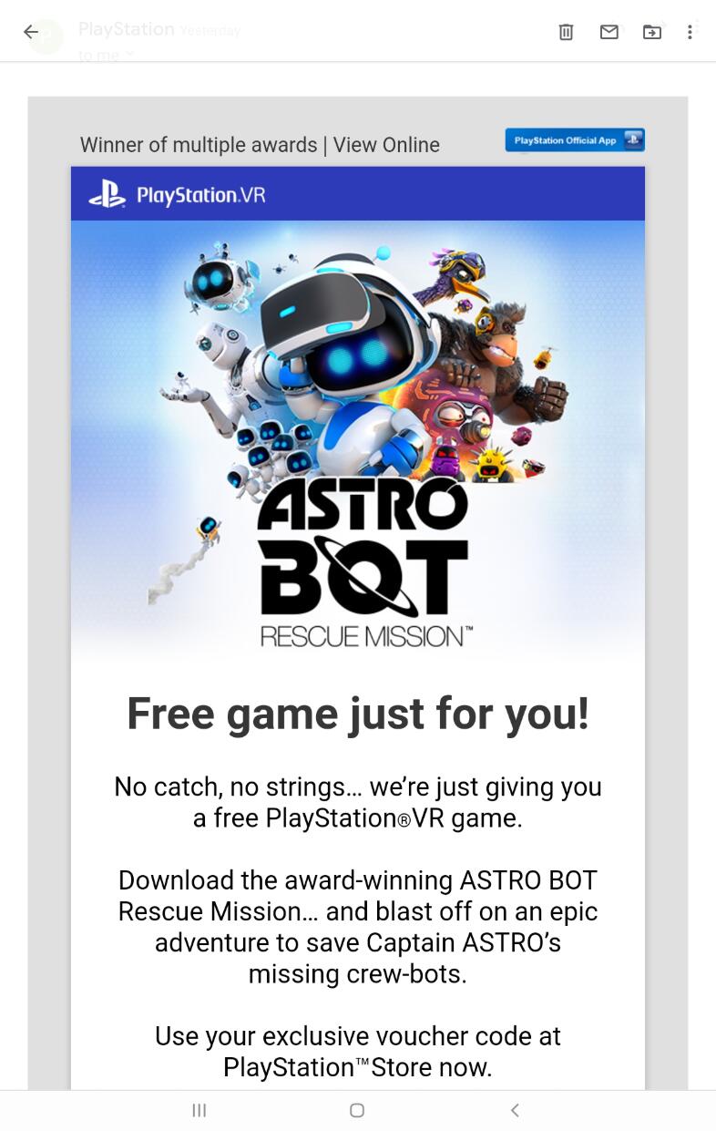 【索尼正在为部分玩家免费送出《宇宙机器人 搜救行动》】有玩家发现PlayStation正在通过邮件为部分玩家免费发放PS VR游戏《宇宙机器人 搜救行动》。目前暂时还不清楚是否仅限于拥有PS VR的玩家还是所有玩家。不过大家不妨检查一下自己的邮箱看看是否也受到了这样的邮件。《宇宙机器人 搜救行动》是一款高分PS VR游戏,本作MC媒体均分达到了惊人的90分。