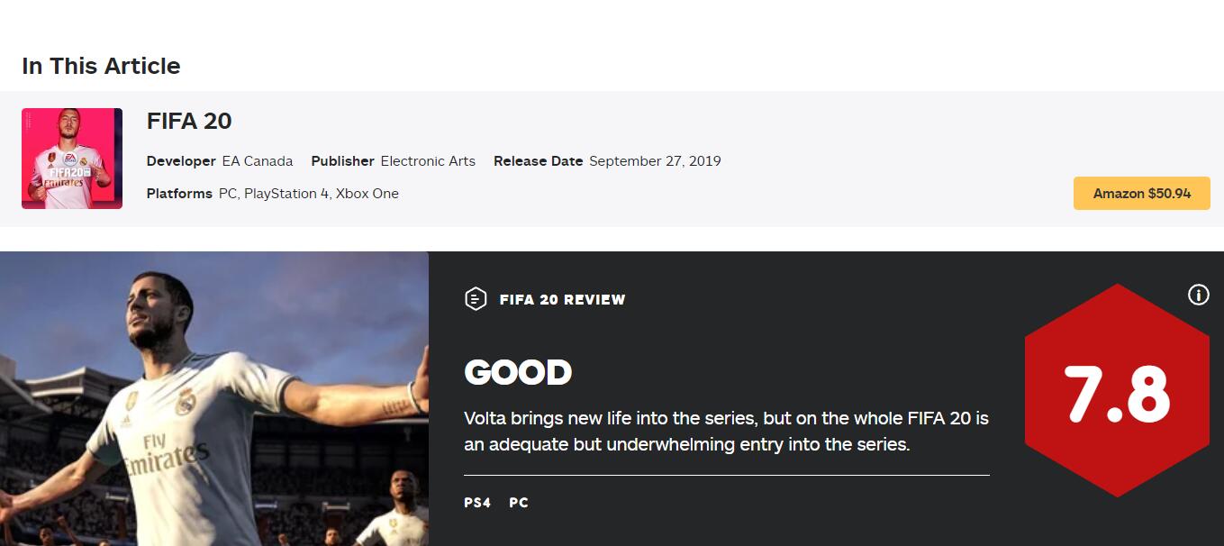 《FIFA 20》获得IGN7.8分良好评价:足够合格但又仅止于此