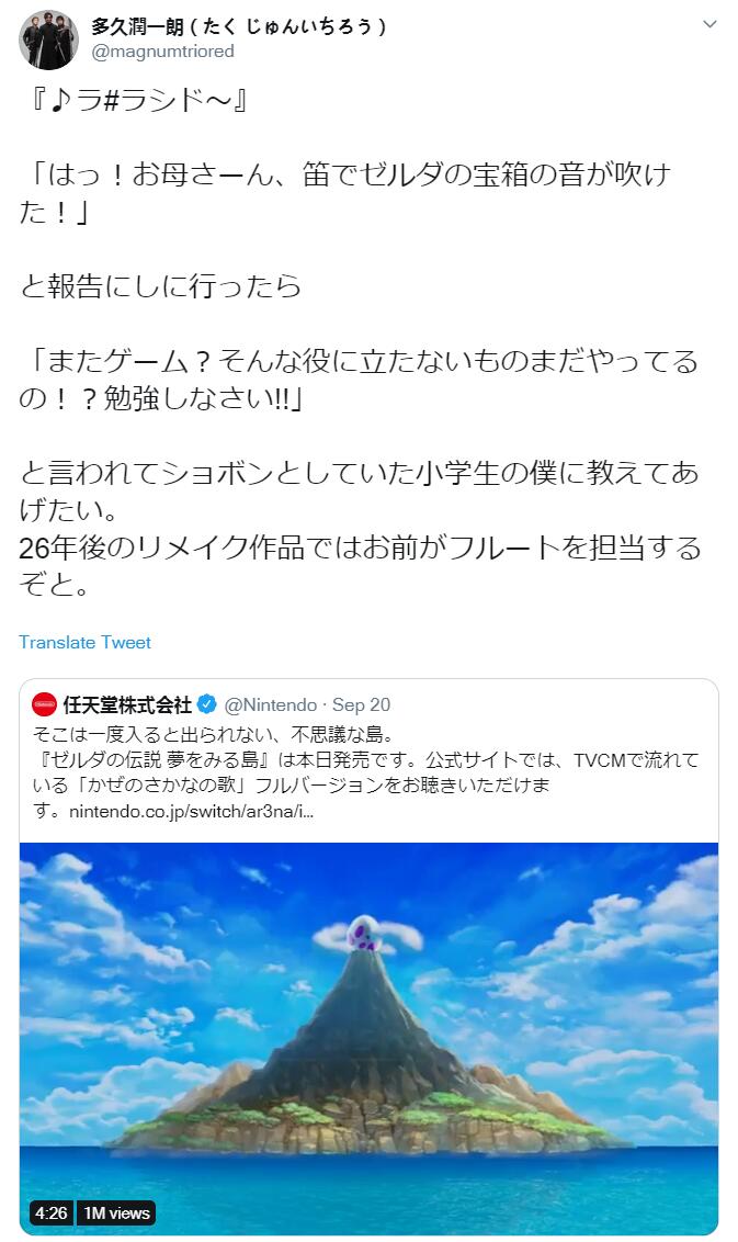 【花26年的时间给自己织一个梦】在《塞尔达传说:织梦岛》发售之际,日本长笛演奏家、作曲家多久润一郎也分享了自己小学时候发生的一件事。当时多久润一郎学会了用笛子吹奏《塞尔达传说》中宝箱的音乐,“啊,能用笛子吹出塞尔达宝箱的音乐了!”多久润一郎高兴地把这件事告诉了妈妈。但妈妈却说道:“又是游戏?你怎么还在玩那种没用的东西?赶紧给我去学习!”受到责骂的多久润一郎很是沮丧。但是现在的多久润一郎想要对那时候的自己说:26年后的《塞尔达传说:织梦岛》将由你来担当长笛演奏!