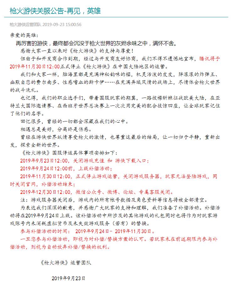 腾讯《枪火游侠》发布停运公告,11月30日关闭游戏服务器