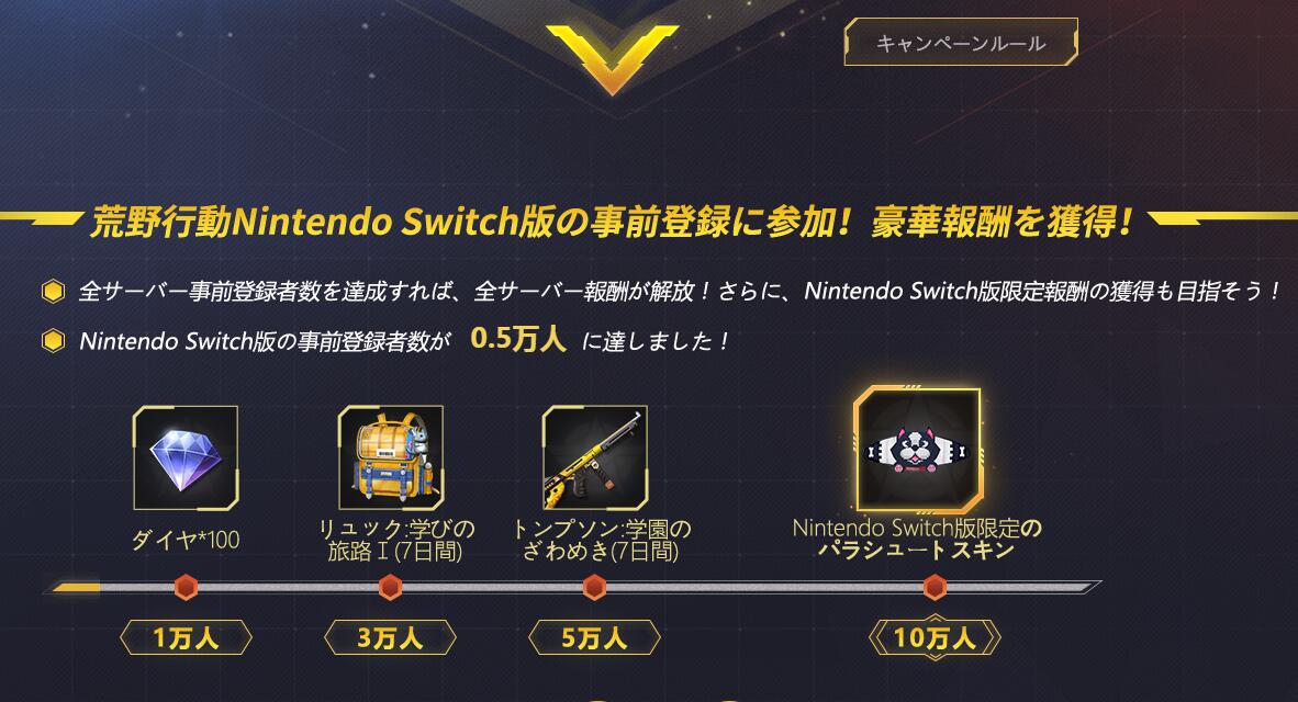 【Switch《荒野行动》开启预约】网易战术射击游戏《荒野行动》目前已经在JP官网开启预约。参与预约可获得游戏内服装奖励,预约达到一定人数还可以获得不同阶段的奖励,最高10万人。目前游戏的预约人数约为0.5万人。根据此官方前直面会的消息,游戏将在10月份登陆Switch平台。