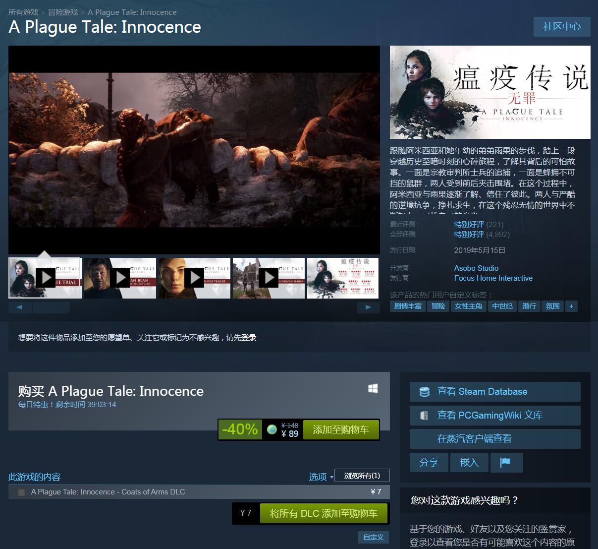《瘟疫传说:无罪》Steam特惠开启,史低价促销仅需89元