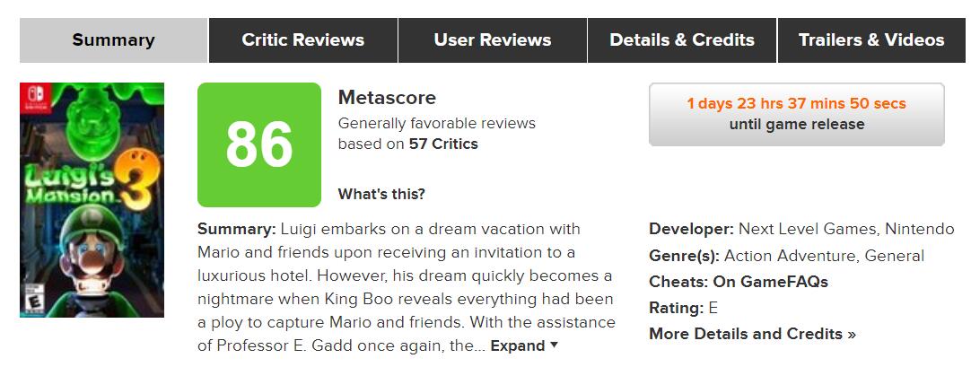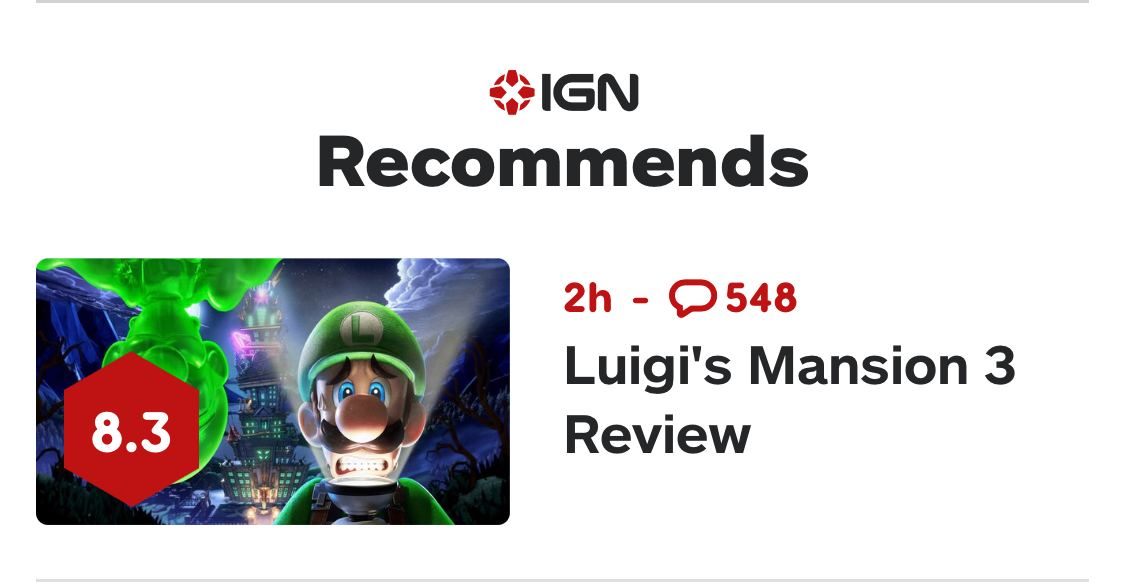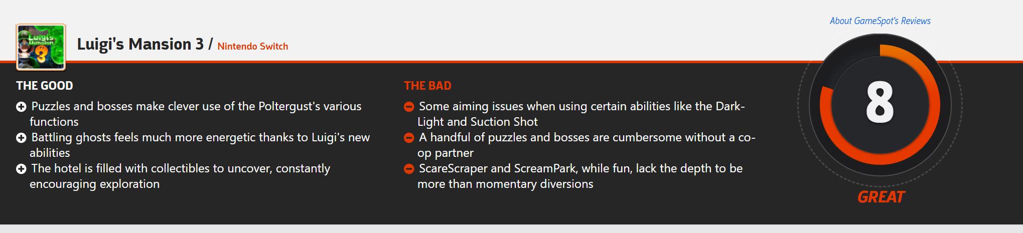 【《路易吉鬼屋3》评分解禁:IGN 8.3分/GameSpot 8分】《路易吉鬼屋3》全球媒体评分解禁,IGN给出了8.3分的评价,GameSpot给出了8分的评价,游戏目前在MC上的媒体平均分为86分。