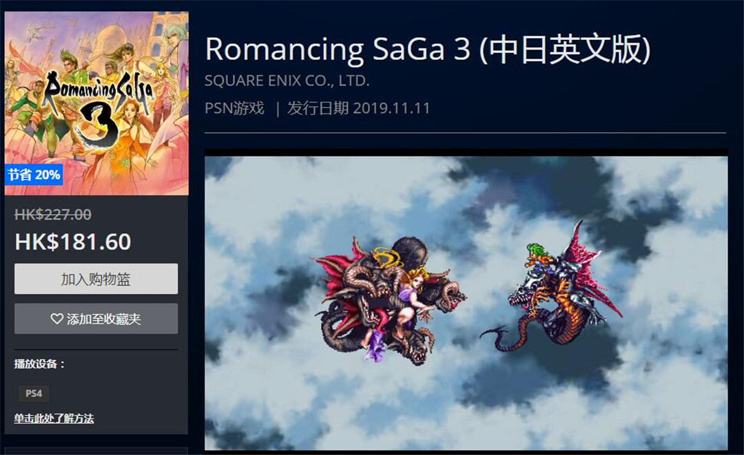 《浪漫沙加3 HD重制版》现已发售,PS4版页面显示包含中文