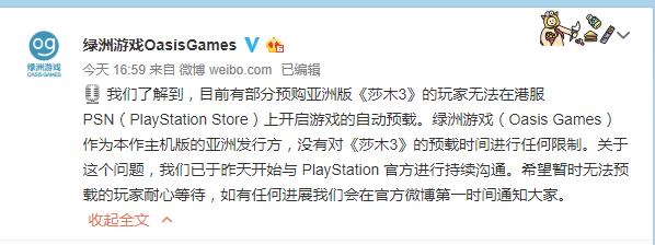 原文:【绿洲游戏回应《莎木3》PS4版无法预载问题】目前有部分预购了《莎木3》的玩家表示无法在PSN商店进行预载,对此游戏发行方绿洲游戏回应表示,没有对《莎木3》的预载时间进行任何限制,目前就该问题已经与PlayStation官方进行了沟通,如有任何进展会在第一时间告知玩家。