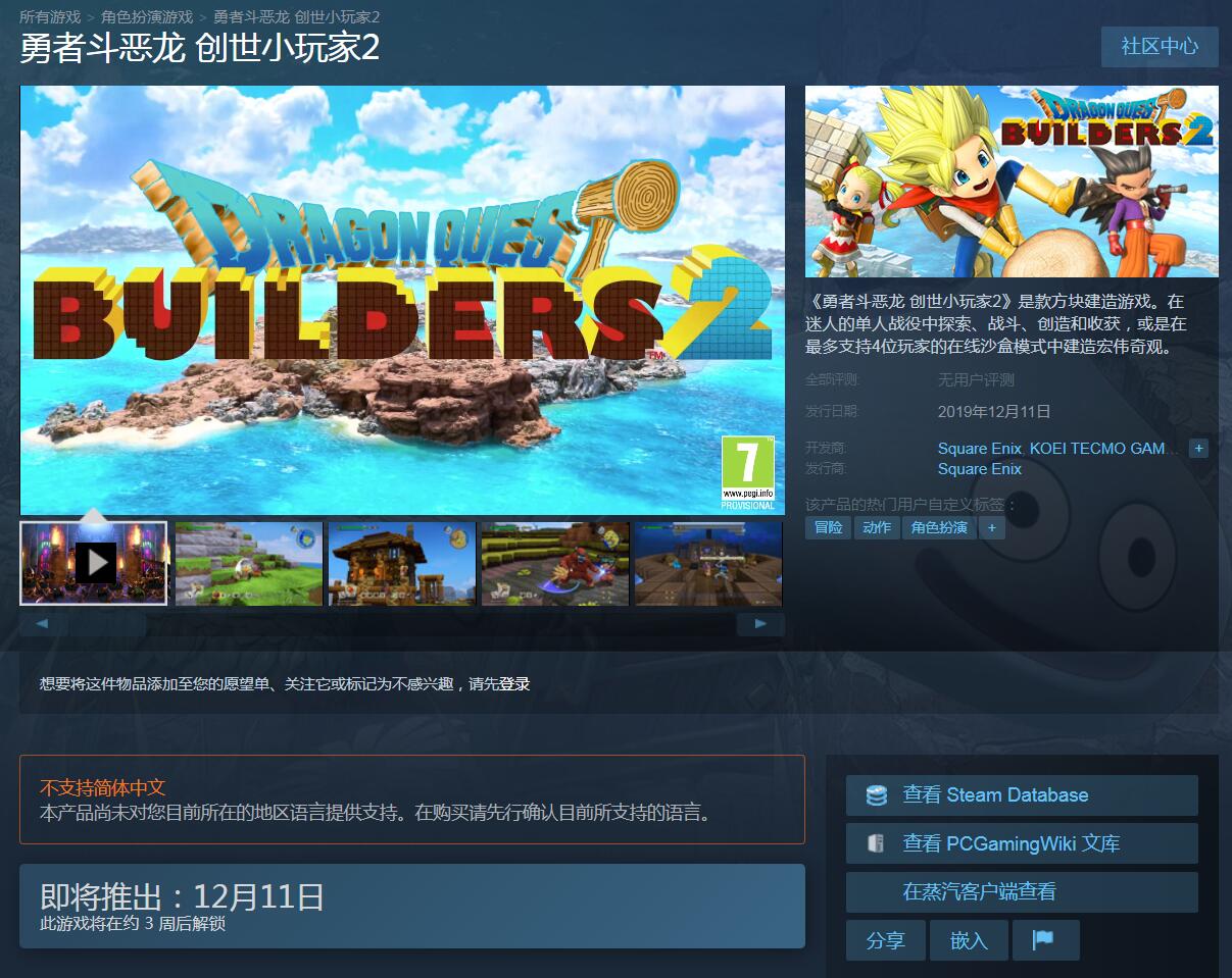 【《勇者斗恶龙:建造者2》上架Steam,12月11日解锁】Steam平台今日上架了《勇者斗恶龙:建造者2》,游戏将于12月11日解锁,售价355元。游戏支持繁体中文,简体中文的翻译工作还在进行中,预计将于2020年初发布。2020年1月6日之前购买游戏还可以获得方块、标志以及肖像画等配方特典。