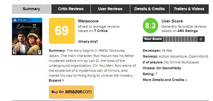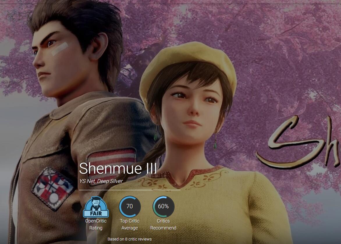 【《莎木3》首批媒体评分解禁】《莎木3》首批媒体评分解禁,其中IGN日本的评价为9分(满分10分)、Gameblog评价7分(满分10分)、VGC评价4分(满分5分)、VG247评价3分(满分5分)、Eurogamer评价为“推荐”。目前本作在Metacritic的媒体平均分为69分(7家媒体),在Opencritic的媒体平均分为70分(8家媒体)。