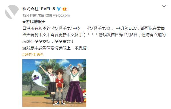 《妖怪手表4++》将在12月5日发售当日更新中文补丁