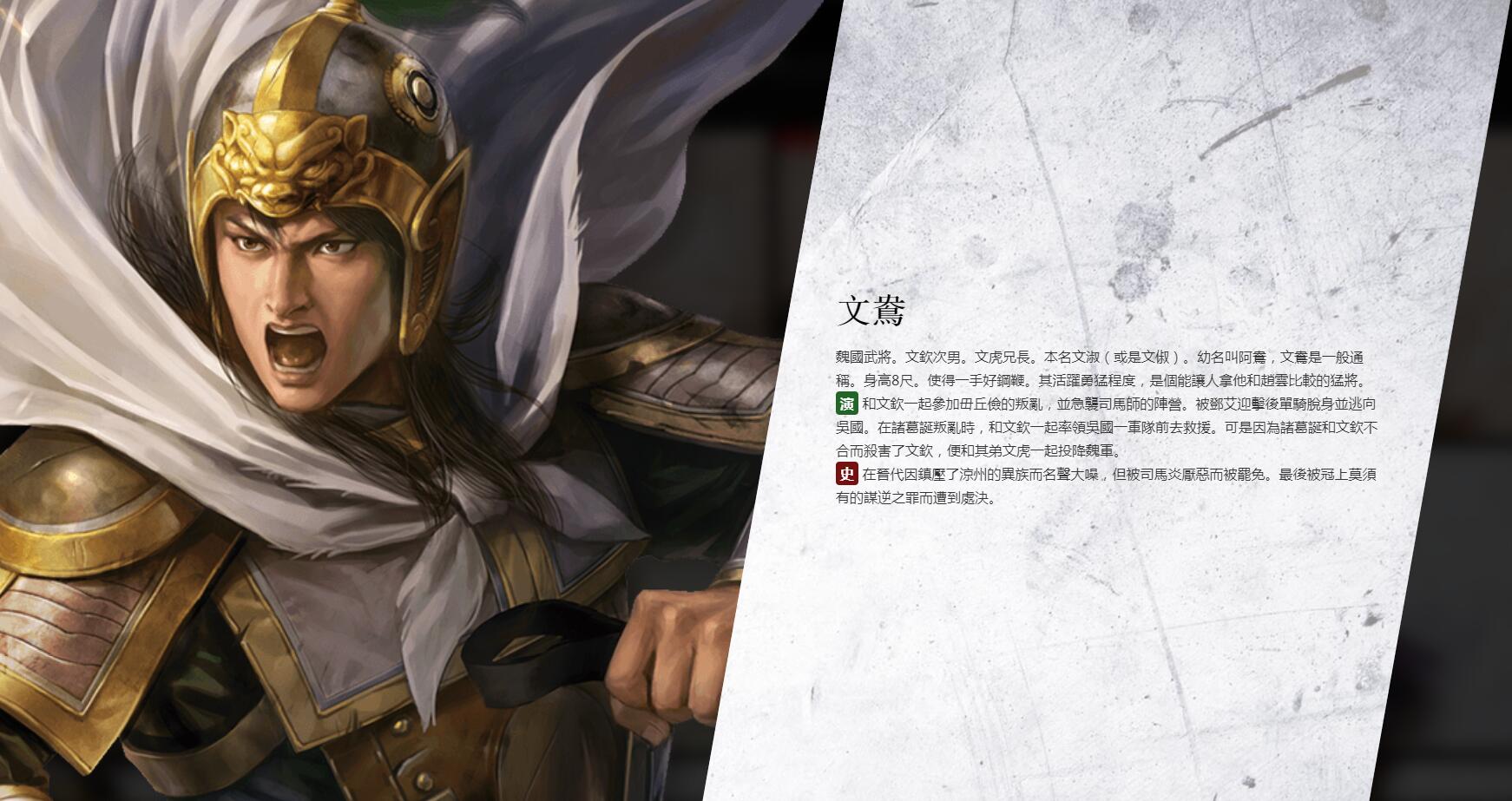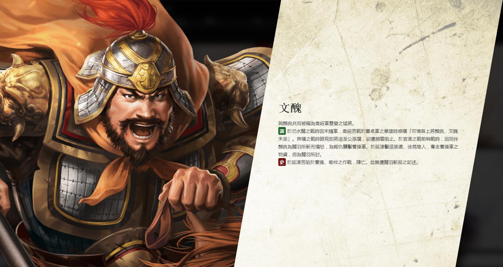 【光荣特库摩更新颜良文丑人设图及介绍】光荣特库摩更新了《三国志14》的官网,公布了七名武将的人设图及介绍。包括袁绍手下的两员大将,颜良文丑,还有张昭、文鸯、张紘、阚泽、审配五位武将。《三国志14》中文版将于2020年1月16日登陆PS4及Steam平台。