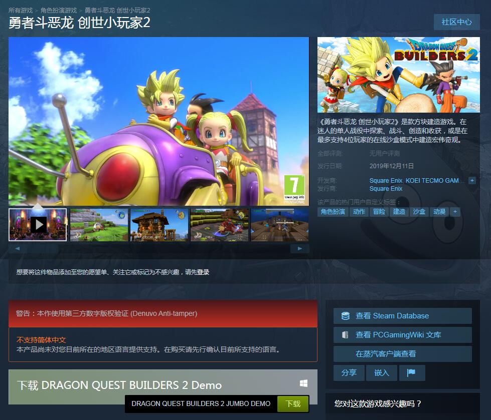 【《勇者斗恶龙:建造者2》试玩Demo上架Steam】Steam平台今日上架了《勇者斗恶龙:建造者2》的免费试玩Demo,现已开放下载,游玩试玩版的玩家可以将存档继承至正式版当中。《勇者斗恶龙:建造者2》将于12月11日登陆Steam平台,国区售价355元。游戏支持繁体中文,简体中文的补丁会在2020年1月24日推出。