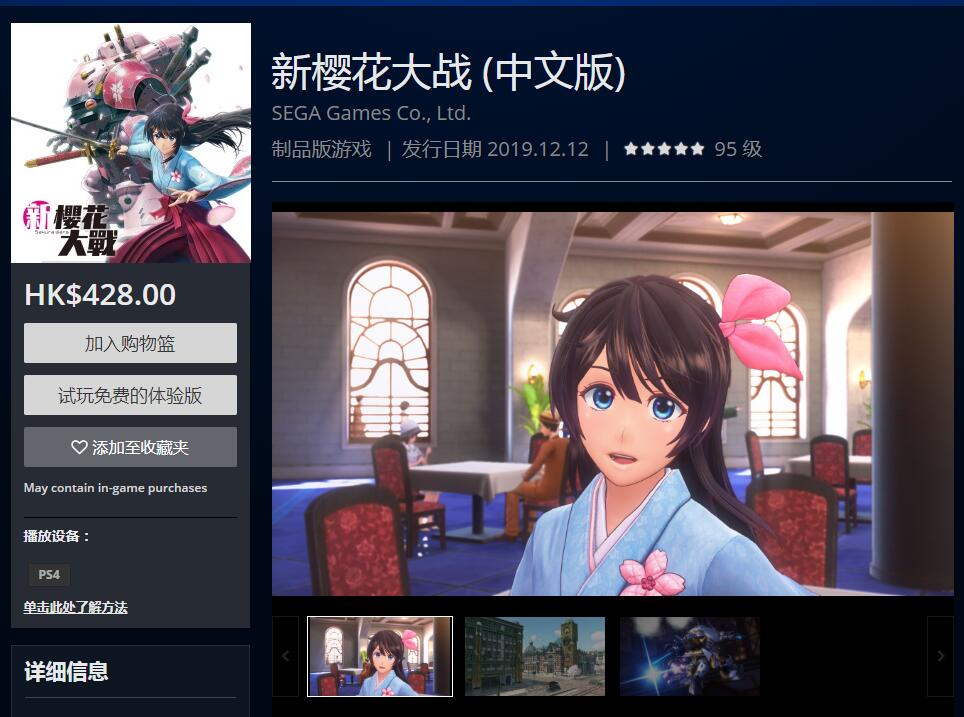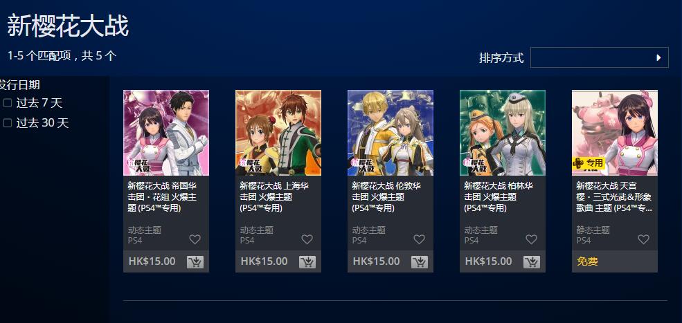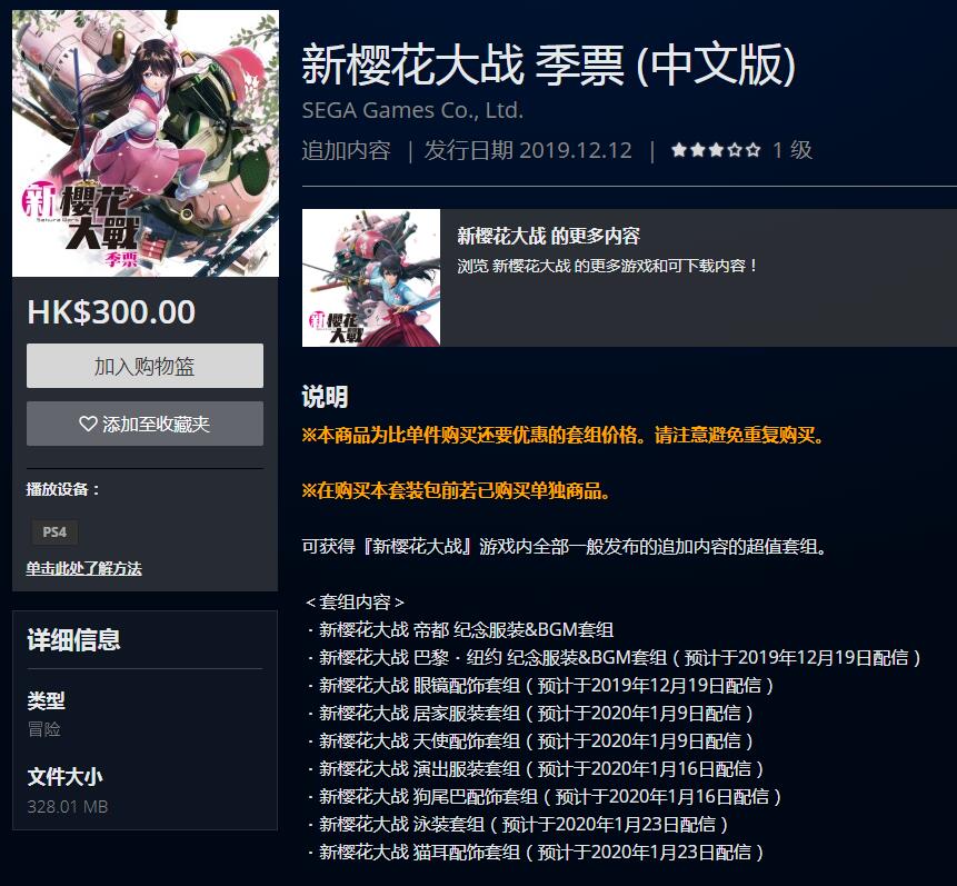 【《新樱花大战》现已正式发售,PSN商店同步上架游戏季票&主题】PS4《新樱花大战》已在今天正式发售,同时PSN商店也上架游戏季票,售价300HKD,包含9款服装&BGM套组,将在2019年12月19日~2020年1月23日期间陆续推出;此外PSN商店还上架了5款PS4主题,其中“天宫樱・三式光武”主题为PS+会员免费领取,其余4款华击团主题每款售价15HKD。