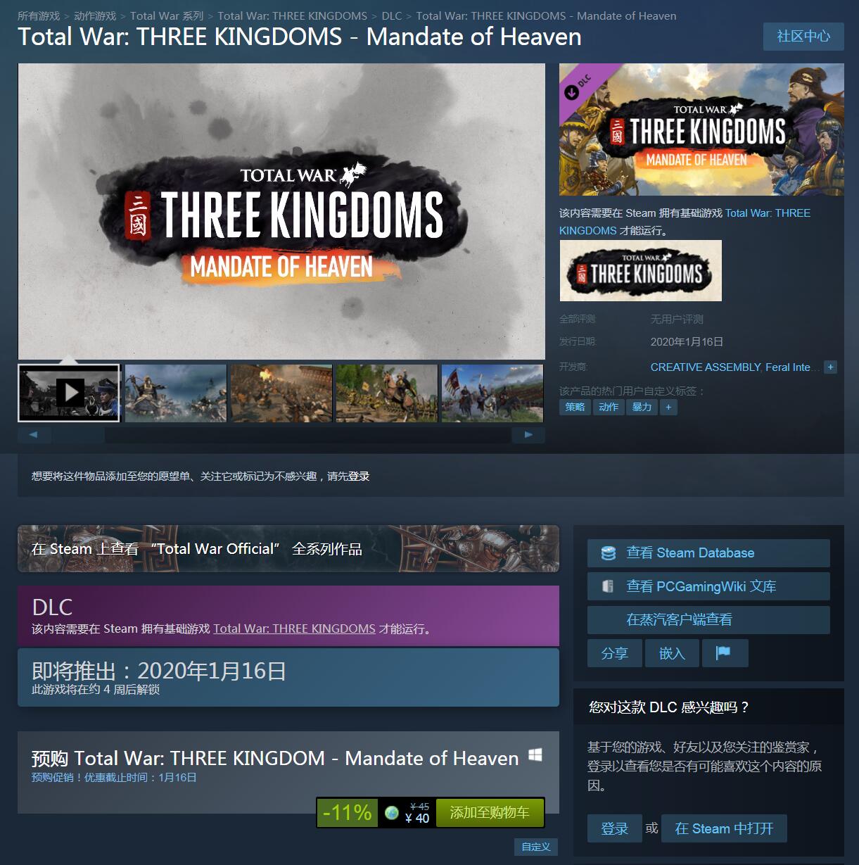 【《全面战争:三国》新DLC“受命于天”公布】《全面战争:三国》官方在昨日晚些时候公布了游戏的新DLC“受命于天”(Mandate of Heaven),目前已经上架Steam平台,售价40元(-10%),将于2020年1月16日推出。这是游戏目前为止最大最丰富的DLC,时间设定在黄巾起义前夕,剧情涵盖了起义全过程,直至步入三国时期。DLC增加了包括张氏三兄弟和汉灵帝在内的六个可玩派系领袖,40个全新战场部队和全新的部队技能,玩家可以在其中体验曹操和刘备等人物传奇的开端。